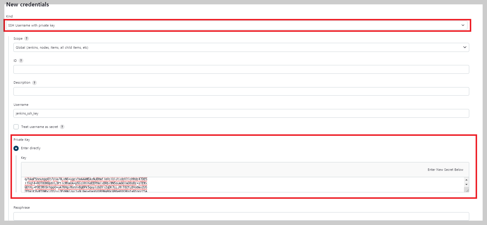 Kind 옵션 > SSH Username with private key 선택 후 Private Key 옵션에 Enter directly 옵션 체크!!
