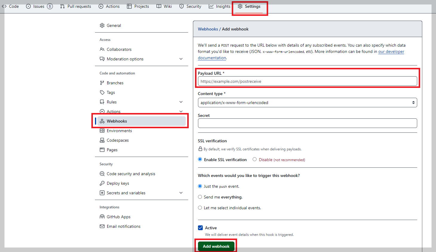먼저 아까처럼 연결하고 싶은 레포지토리 Settings > 왼쪽 메뉴 Webhooks를 선택 후 Add webhook 버튼 클릭!!