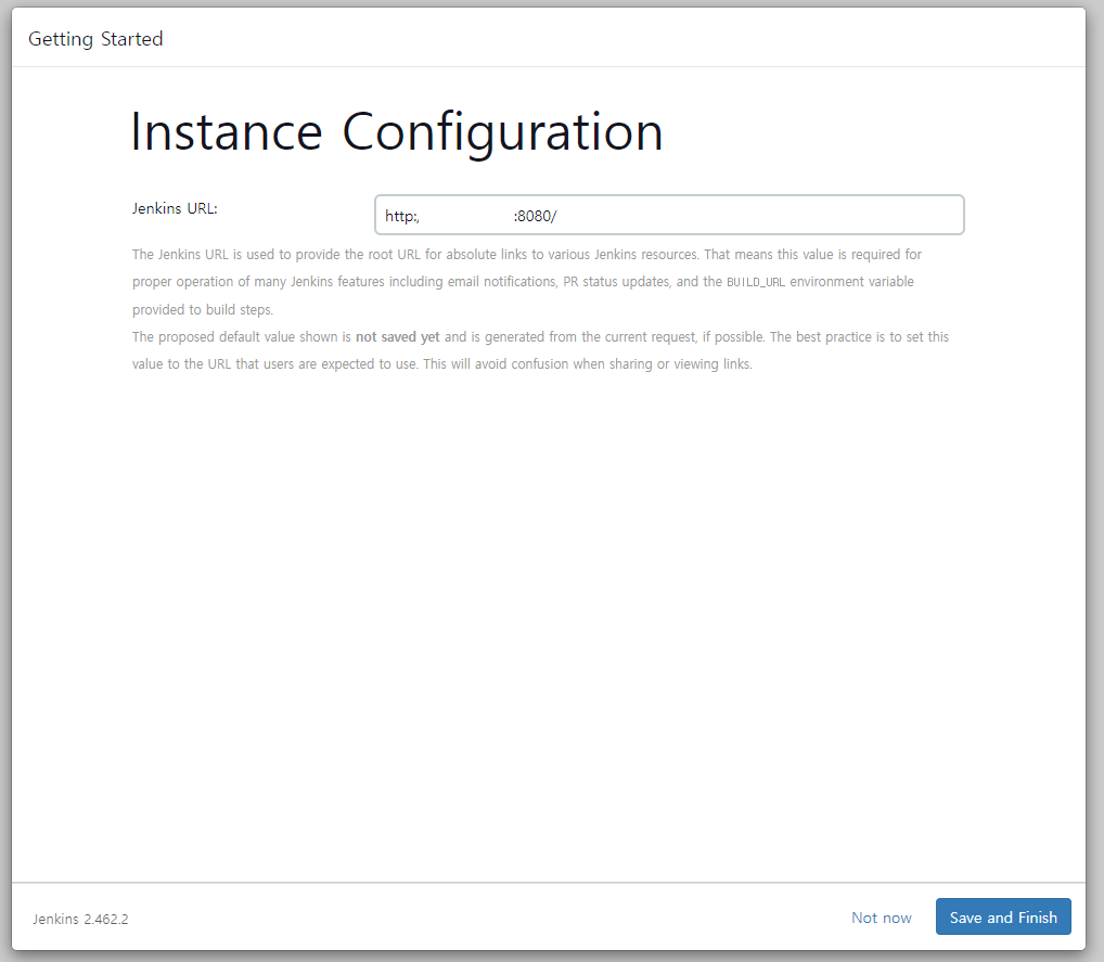 젠킨스 url은 자동으로 입력되어 있어서 Save and Finish를 클릭!