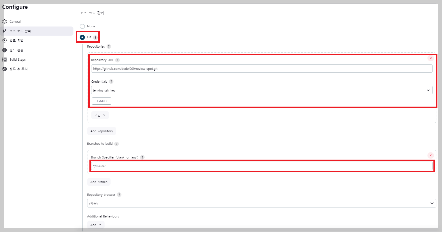 이후 Job 구성 페이지에서 저번에 한 것처럼 [소스 코드 관리] > git을 선택!!